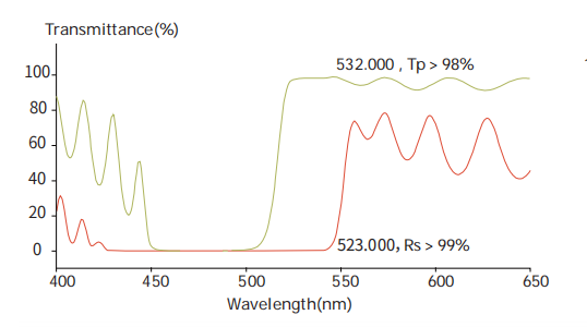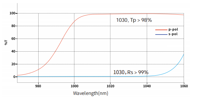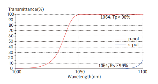 When oriented at the Brewster angle, the P-polarized component is transmitted with high efficiency (Tp > 98%), while the S-polarized component is reflected (Rs > 99%). This design eliminates the need for optical cement, significantly increasing the laser induced damage threshold (LIDT) compared to cemented polarizing cubes.