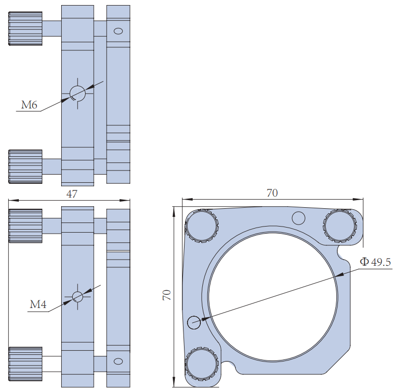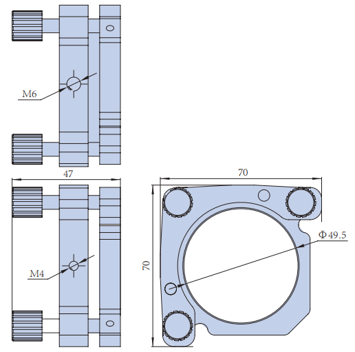 | VL-BSM-03-70 | Φ70 mm | Tip/Tilt | M6x0.25, Disc Spring | 3-point PTFE support, large aperture protection |