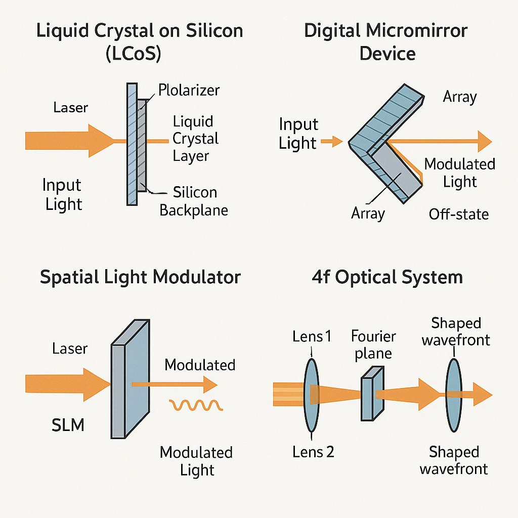 - Acousto-Optic Modulator (AOM) Arrays Acoustic waves in a crystal create a dynamic diffraction grating. By controlling radio-frequency inputs, one can steer and shape the beam. AOM arrays provide nanosecond-scale response but typically offer limited pixel counts and analog amplitude control rather than full phase modulation.